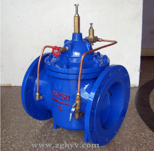 當(dāng)閥門從進(jìn)口端給水時(shí),水流過針閥進(jìn)入主閥控制室,并經(jīng)過導(dǎo)閥、球閥流出主閥控制室到出口,此時(shí)主閥處于全開或浮動(dòng)狀態(tài)。調(diào)定主閥上部的流量調(diào)節(jié)閥,可為主閥設(shè)定一定開度。調(diào)節(jié)針閥開度和調(diào)節(jié)導(dǎo)閥彈簧壓力,即可使主閥開度保持在設(shè)定開度,并在壓力變化時(shí)導(dǎo)閥進(jìn)行自動(dòng)調(diào)節(jié),保持流量不變。