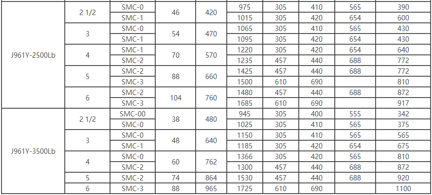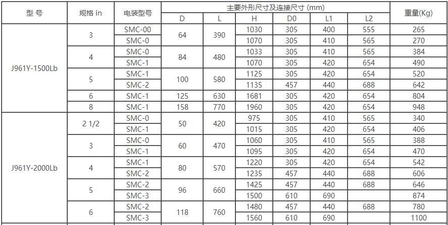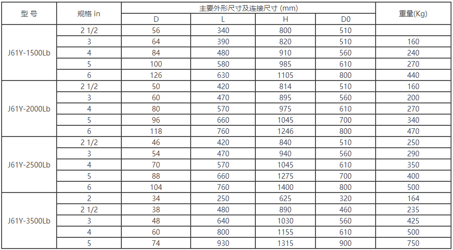 高溫高壓焊接截止閥J61Y/J961Y/J962Y/J561Y主要外形連接尺寸及重量: