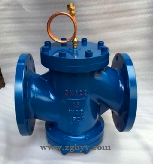 現以安裝在回水管道上的ZYC型自力式壓差控制閥為例說明工作原理。當供水壓力P1增大或減少時。信號由連接管傳入膜片上腔,帶動閥芯下移或上移,使閥座的流通而積減小或增大,P2-P3也增大或減小,直至P1 -P2保持原值恒定。當回水壓力P3增大或減小的瞬間,由閥座流向出口的流速降低或升高,膜片下壓力P2也在這個瞬間增高或降低,帶動閥芯上移或下移,直至膜片的受力重新平衡,P2恢復原值,P1-P2保持原值恒定.從而保證了被控系統的供回水間壓差基本不變。