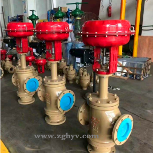 ZJHF(H)型氣動三通調節閥采用圓筒型薄壁窗口形閥芯導向,不同于柱塞形閥芯的襯套導向。配用多彈簧執行機構,具有結構簡單、重量輕、體積小、拆裝方便等優點。廣泛應用于精確控制氣體、液體等介質的工藝參加如壓力、流量、溫度、液位保持在給定值。適合于把一種流體通過三通閥分成二路流出或理把兩種流體經三通閥合并成一種流體的場合。